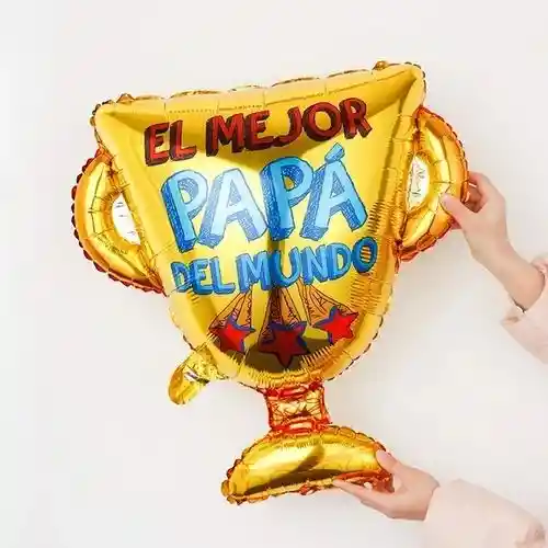 Globo metalizado en forma de trofeo en tamaño de 60 cm x 65 cm con estampado el mejor papá del mundo. Incluye pitillo para poder inflar el globo con aire