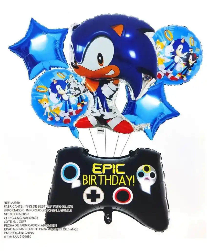 *********************GLOBOS Y PELUCHES MASMELO********************* - Por tu compra llevas: 1 Globo Sonic 76x48cm 2 Globo circular sonic 45x45cm 2 Globo estrella azul 45x45cm 1 Globo control video juego 63x48cm 1 Pitillo para inflar globos Material: metalizado Foil. *Los globos se entregan desinflados, tu compra no incluye el montaje ni la decoración, el servicio de armado no lo tenemos disponible. sin embargo te damos todas las instrucciones para hacer de modo profesional. Si deseas adicionar otros articulos a tu compra puedes escribirnos, recuerda que Somos Globos y Peluches Masmelo ;) - En ciudades fuera de Bogotá despachamos para el mismo día si compras antes de las 11AM (no incluye festivos) - En Bogotá despachamos para el mismo día, si haces el pedido antes de las 4PM (no incluye festivos)