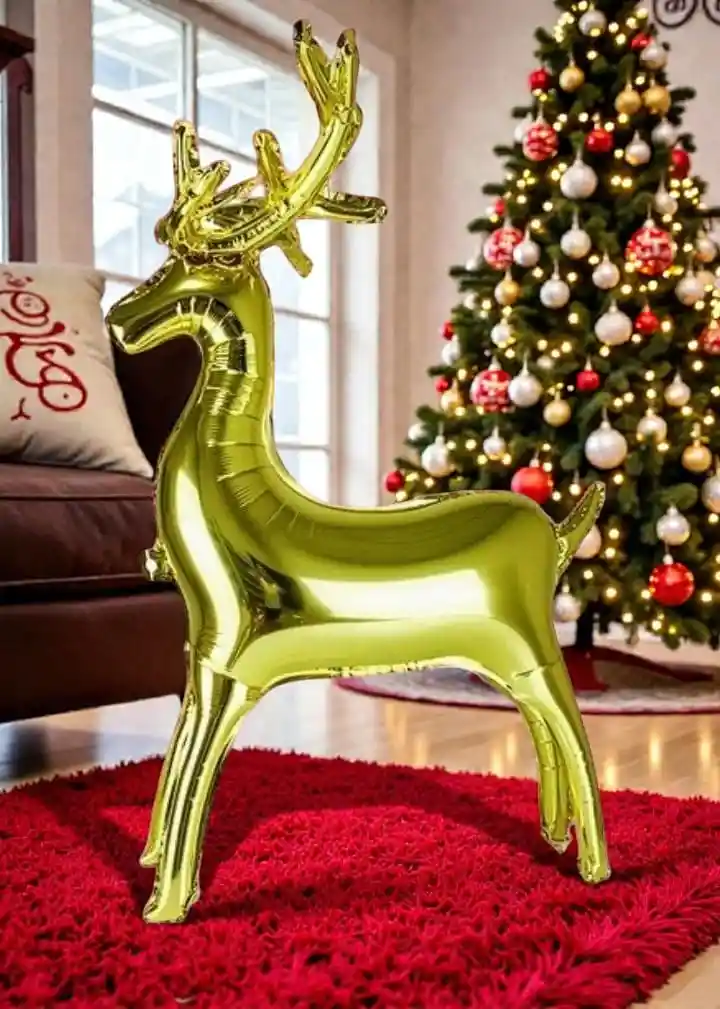 Decora tus espacios con un toque de brillo y sofisticación usando este globo venado navideño dorado, perfecto para ambientar fiestas, vitrinas, mesas temáticas y cualquier rincón navideño. Su diseño metalizado en color dorado aporta un estilo moderno, elegante y festivo que resalta en cualquier decoración. Características: •Material: Globo metalizado •Color: Dorado brillante •Diseño: Venado navideño •Medidas: 94 x 57 cm Ideal para: Decoraciones navideñas, fotografías, eventos, mesas dulces y ambientes temáticos •Se entrega desinflado ¡El complemento perfecto para una Navidad llena de luz y encanto!