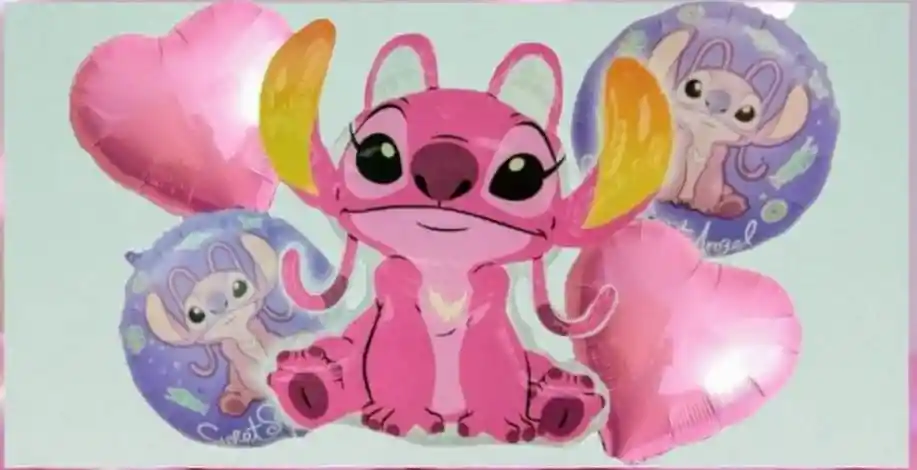 Bouquet Globos Metalizados Stitch Ángel X 5 Piezas Corazones Rosa Angel Stitch