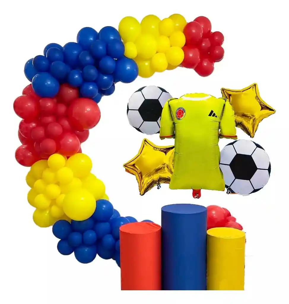 ******GLOBOS Y PELUCHES MASMELO***** Somos Mercado Lider Platinum Distribuidores autorizados de Sempertex Te damos toda la asesoria para que tú puedas armar tu propio arco Por tu compra te llevas: 25 Globo rojo 30cm 15 Globo rojo 13cm 25 Globo amarillo 30cm 15 Globo amarillo 13cm 25 Globo azul 30cm 15 Globo azul 13cm 1 Cinta de arco 5 metros 1 Cinta de 100 puntos adhesivos 1 Globo camisa Colombia 65x45cm 2 Globo estrella dorado 45x45cm 2 Globo circular balón 45x45cm *No incluye el montaje ni la decoración, el servicio de armado no lo tenemos disponible. sin embargo te damos todas las instrucciones para hacer de modo profesional. Si deseas adicionar otros articulos a tu compra puedes escribirnos, recuerda que Somos Globos y Peluches Masmelo Si necesitas variación en los colores, colocar un número, más Globos o realizar otros cambios en el diseño original escribenos para ver si podemos hacerlo. Tenemos todo lo necesario para tus decoraciones, somos lo último en tendencias mundiales decorativas. Tenemos disponible: Vasos, platos, manteles, guirnaldas, cubiertos, Globos de todo tipo, números, letreros, vela, Etc. Puedes encontrar los articulos de nuestra tienda en el siguiente link, copia y pega, si no encuentas lo que necesitas escribenos: