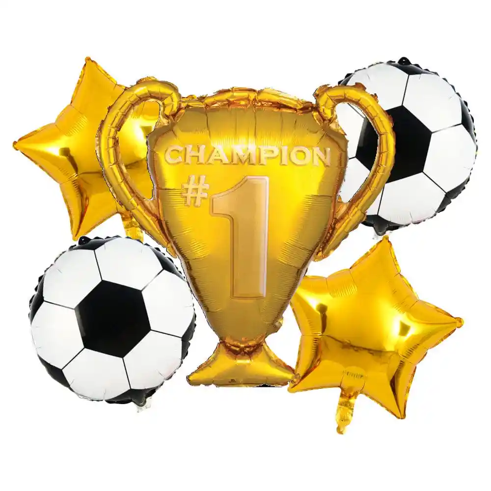 Globos de copa de futbol con dos balones en globos mas dos estrellas plateadas