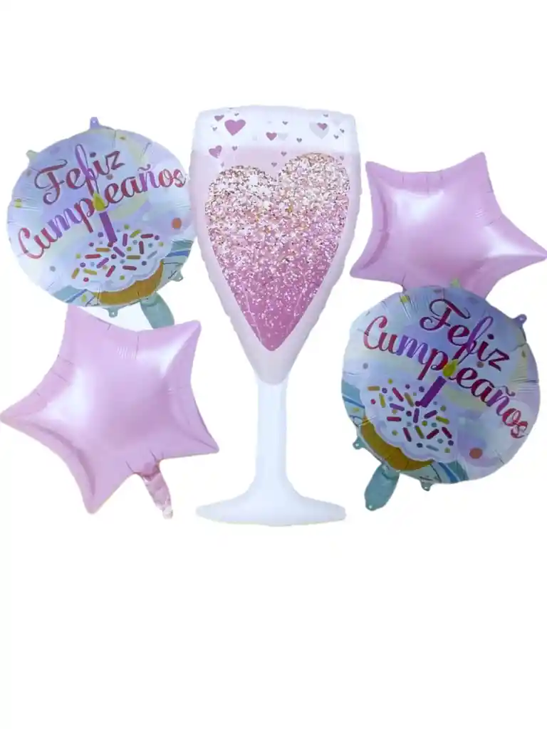 5 globos metalizados para fiesta cumpleaños 1 globo de copa de 88 cm metalizado 2 globos de estrellas rosadas de 45 cm 2 globos redondos de la tematica feliz cumpleaños de 45 cm globos metalizados disponibilidad inmediata GLOBOS SE ENVIAN SIN INFLAR