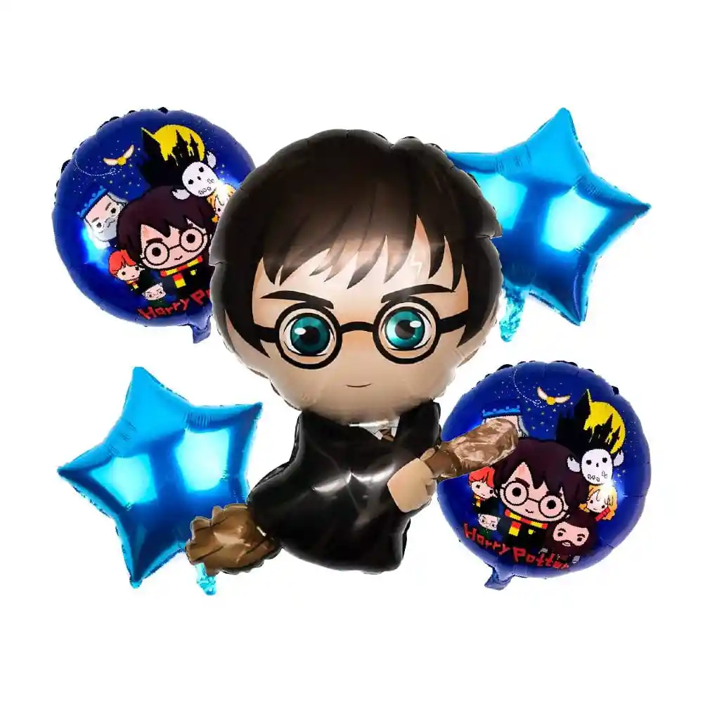 Globos de Harry Poter x 5 unidades contiene 1 globo con el personaje de harry potter en su escoba mas 2 globos redondos con los personajes y 2 estrellas azules