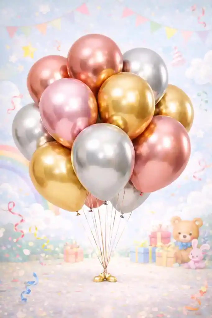 Eleva la decoración de tus celebraciones con este exclusivo set de globos látex cromados en tonos dorado, oro rosa y plateado. Su acabado tipo espejo aporta un estilo moderno, elegante y versátil, ideal para eventos infantiles suaves, fiestas premium, cumpleaños, baby showers y celebraciones especiales. Características: Contenido: 12 globos Colores: Dorado, Oro Rosa y Plateado Tamaño: R12 (aprox. 12 pulgadas / 30 cm inflados) Material: Látex de alta calidad Acabado: Cromado brillante efecto espejo. Importante: Los globos se entregan desinflados Apto para inflar con aire o helio Perfectos para ramilletes, arcos de globos, centros de mesa o decoraciones minimalistas y elegantes.