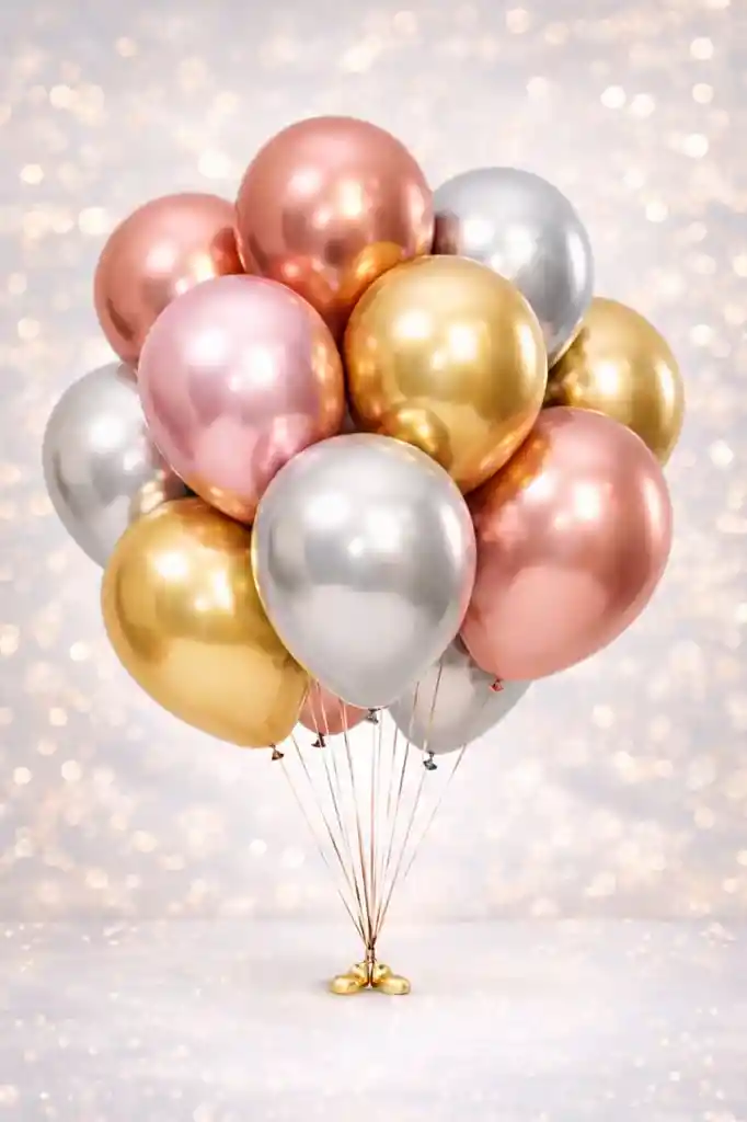Eleva la decoración de tus celebraciones con este exclusivo set de globos látex cromados en tonos dorado, oro rosa y plateado. Su acabado tipo espejo aporta un estilo moderno, elegante y versátil, ideal para eventos infantiles suaves, fiestas premium, cumpleaños, baby showers y celebraciones especiales. Características: Contenido: 12 globos Colores: Dorado, Oro Rosa y Plateado Tamaño: R12 (aprox. 12 pulgadas / 30 cm inflados) Material: Látex de alta calidad Acabado: Cromado brillante efecto espejo. Importante: Los globos se entregan desinflados Apto para inflar con aire o helio Perfectos para ramilletes, arcos de globos, centros de mesa o decoraciones minimalistas y elegantes.