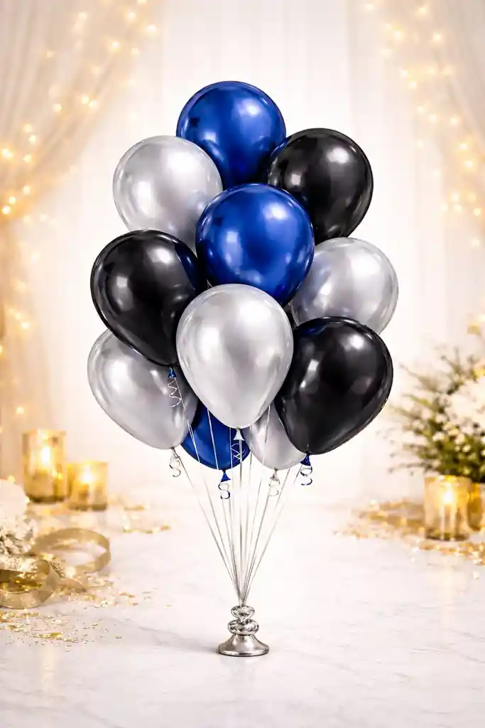 Bouquet elegante y moderno compuesto por globos látex R12 satín en una sofisticada combinación de azul, negro y plateado. Ideal para celebraciones de adulto, cumpleaños, eventos especiales y decoraciones con estilo sobrio y premium. Incluye: 12 globos látex R12 (12 pulgadas aprox.) •4 globos color azul satín •4 globos color negro satín •4 globos color plateado satín. Características: Acabado satín elegante y moderno Ideal para cumpleaños de adulto y celebraciones formales Material resistente y de excelente calidad Apto para inflar con aire o helio Perfecto para bouquets, decoración de mesas y espacios principales Importante: El producto incluye únicamente los 12 globos. Los globos se entregan desinflados. Cintas, u otros accesorios visibles en las imágenes son solo para ambientación y no están incluidos.