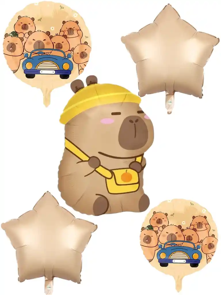 Globos metalizados de capibara x5 globos fiestas animadas de capibara 1 globo de capibara de 65 cm aproximados 2 globos redondos de la tematica de 45 cm 2 globos de estrellas de 45 cm son metalizados colores tal cual la foto Material metalizado facil de inflar y preservar por mucho tiempo globos se envían sin inflar SE ENVIAN LOS QUE SE ENCUENTREN DISPONIBLES EN INVENTARIO si deseas algo adicional indicanos y con gusto te colaboramos