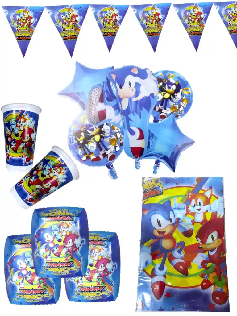 decoracion fiesta de sonic incluye 5 globos metalizados: 4 de 45 cm y 1 de 65 cm aproximados 1 banderin 12 vasos plastico 12 platos plastico 1 mantel de plastico los globos se envian sin inflar si deseas algo adicional indicanos y con gusto te colaboramos