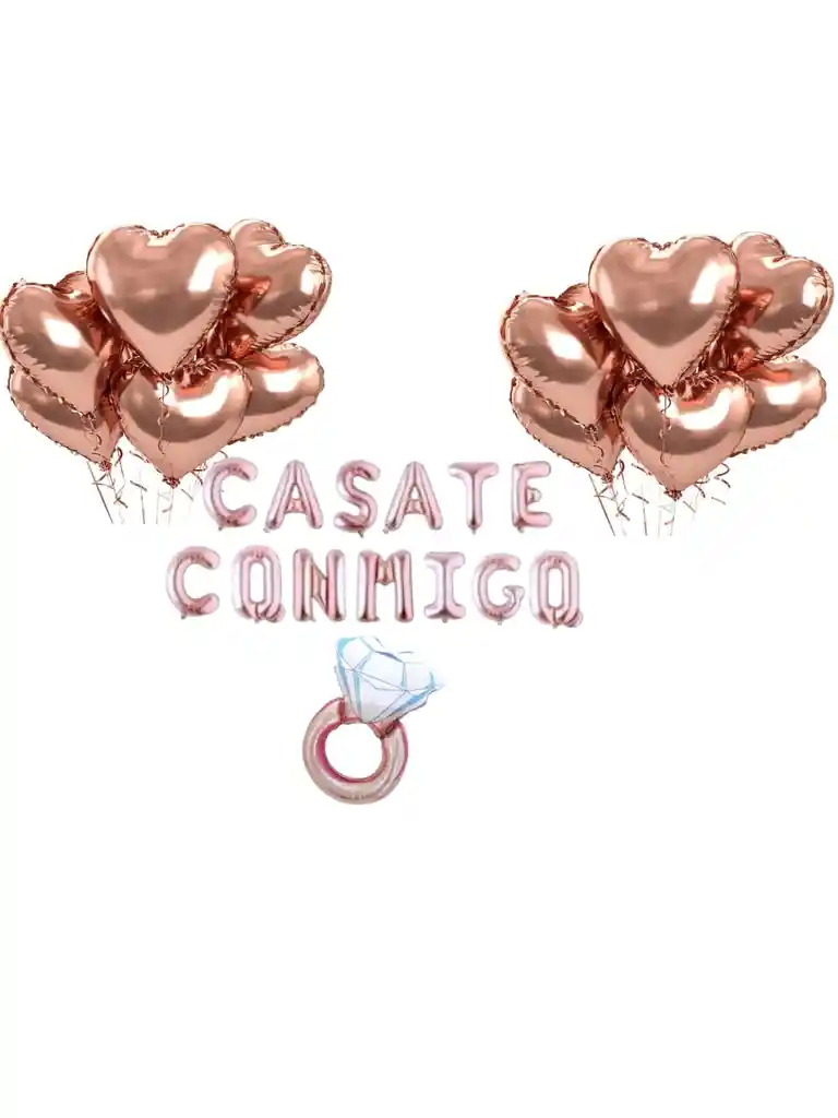 globos metalizados para pedir la mano casate conmigo color oro rosa y dorado 12 globos de corazon metalizados de 45 cm 1 letrero en globo de casate conmigo con un globo de anillo tamaño de 47 cm x 71 cm los globos se envian sin inflar