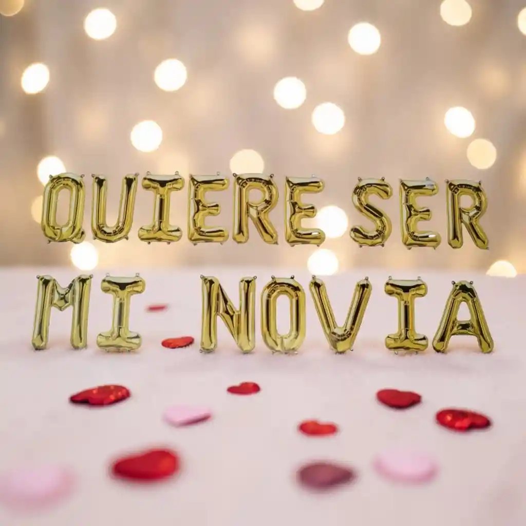 Esta imagen presenta un mensaje romántico y brillante de una propuesta de matrimonio, utilizando globos metalizados dorados que dicen "QUIERE SER MI NOVIA". El brillo metálico de los globos añade un toque de elegancia y sofisticación a este momento tan especial. Ideal para capturar la emoción y el amor en una propuesta única, reflejando un compromiso lleno de lujo y ternura. •Color: Dorado •Vienen 16 globos de Letras •Medidas: Alto:45 cm TENER EN CUENTA: •Los globos vienen desinflados •En la compra solo vienen incluidos los globos, demás accesorios son para decoración de la imágen.