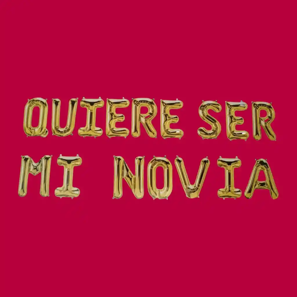 Esta imagen presenta un mensaje romántico y brillante de una propuesta de matrimonio, utilizando globos metalizados dorados que dicen "QUIERE SER MI NOVIA". El brillo metálico de los globos añade un toque de elegancia y sofisticación a este momento tan especial. Ideal para capturar la emoción y el amor en una propuesta única, reflejando un compromiso lleno de lujo y ternura. •Color: Dorado •Vienen 16 globos de Letras •Medidas: Alto:45 cm TENER EN CUENTA: •Los globos vienen desinflados •En la compra solo vienen incluidos los globos, demás accesorios son para decoración de la imágen.