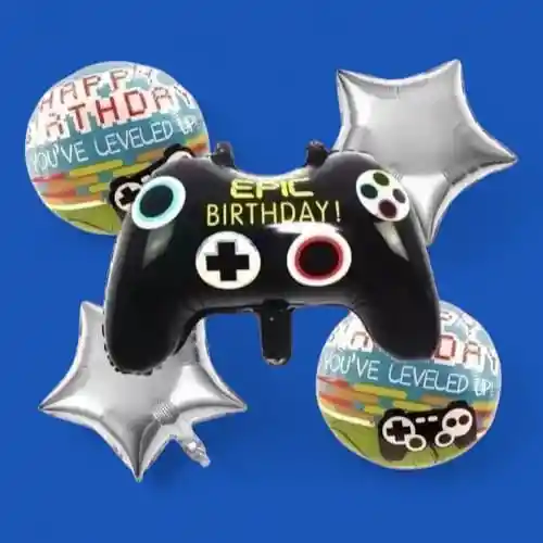 Descripción: Celebra al máximo con este set de globos metalizados gamer inspirado en el mundo de los videojuegos. Incluye un globo central con forma de control y mensaje “Epic Birthday”, acompañado de 2 globos redondos con diseño “Happy Birthday Level Up” y 2 estrellas blancas. Características: Medidas: •1 Control: 69X48cm •2 Globos Redondos: 45x45cm •2 Globos Estrellas: 45x45cm •Diseño moderno ideal para fiestas gamer o temáticas juveniles. •Material: globo metalizado resistente y reutilizable. •Fácil de instalar y combinar con otros accesorios decorativos. Importante: •Los globos se entregan desinflados. •Solo se incluye lo que se indica en la descripción los demás elementos son decorativos para la foto.