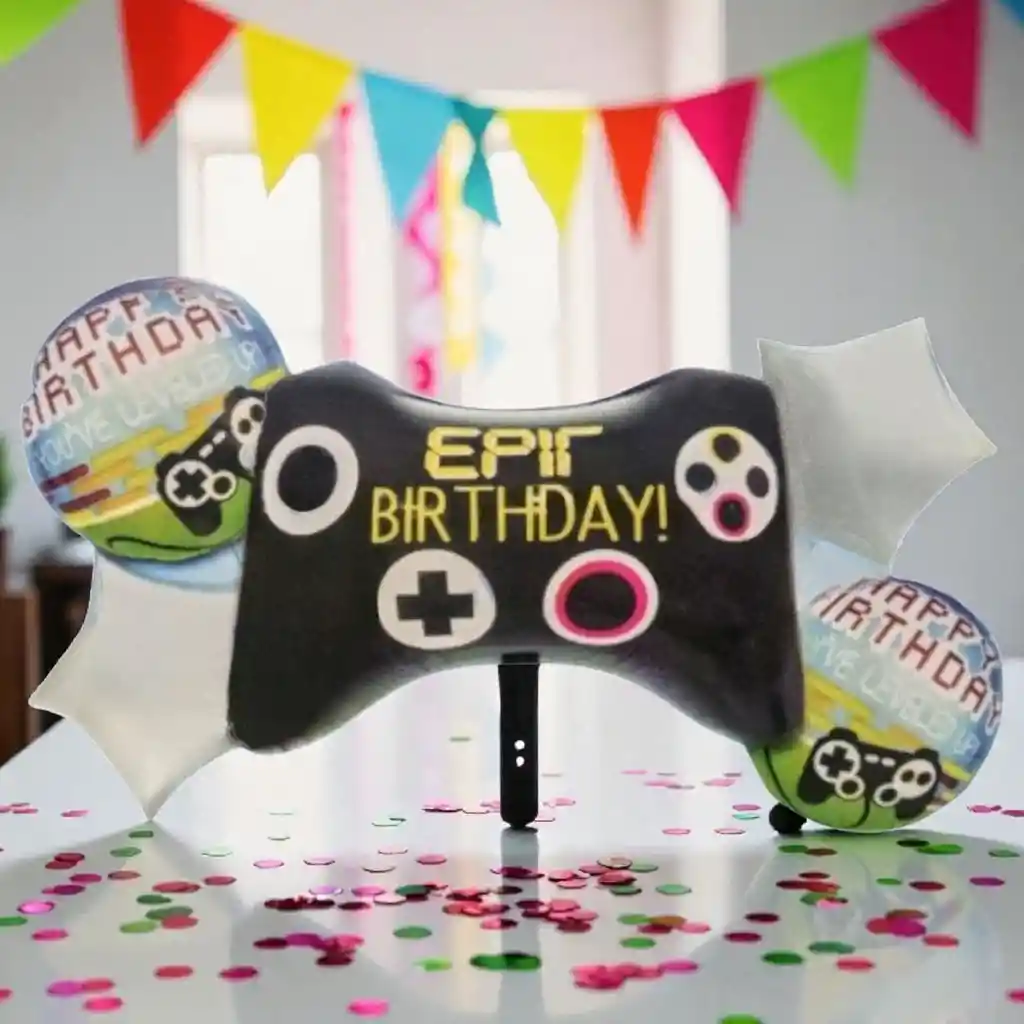 Descripción: Celebra al máximo con este set de globos metalizados gamer inspirado en el mundo de los videojuegos. Incluye un globo central con forma de control y mensaje “Epic Birthday”, acompañado de 2 globos redondos con diseño “Happy Birthday Level Up” y 2 estrellas blancas. Características: Medidas: •1 Control: 69X48cm •2 Globos Redondos: 45x45cm •2 Globos Estrellas: 45x45cm •Diseño moderno ideal para fiestas gamer o temáticas juveniles. •Material: globo metalizado resistente y reutilizable. •Fácil de instalar y combinar con otros accesorios decorativos. Importante: •Los globos se entregan desinflados. •Solo se incluye lo que se indica en la descripción los demás elementos son decorativos para la foto.