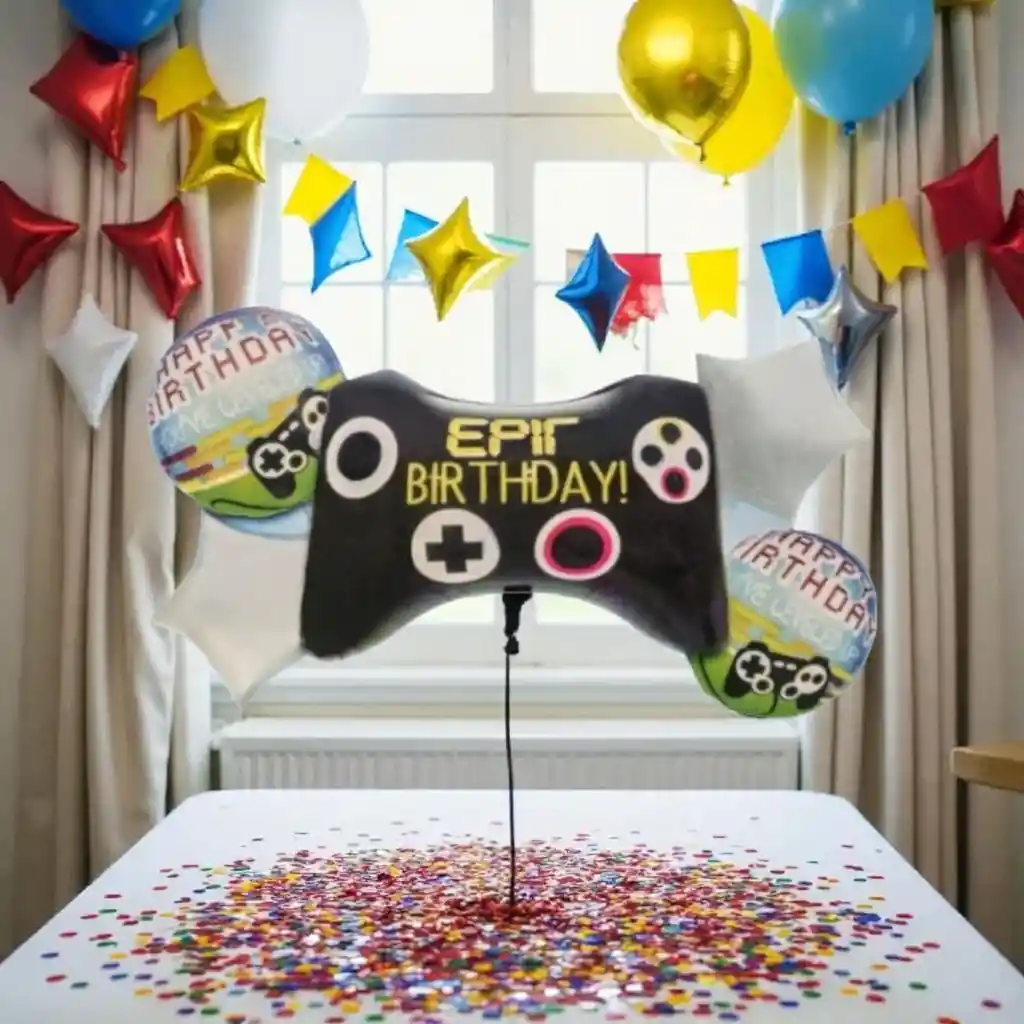 Descripción: Celebra al máximo con este set de globos metalizados gamer inspirado en el mundo de los videojuegos. Incluye un globo central con forma de control y mensaje “Epic Birthday”, acompañado de 2 globos redondos con diseño “Happy Birthday Level Up” y 2 estrellas blancas. Características: Medidas: •1 Control: 69X48cm •2 Globos Redondos: 45x45cm •2 Globos Estrellas: 45x45cm •Diseño moderno ideal para fiestas gamer o temáticas juveniles. •Material: globo metalizado resistente y reutilizable. •Fácil de instalar y combinar con otros accesorios decorativos. Importante: •Los globos se entregan desinflados. •Solo se incluye lo que se indica en la descripción los demás elementos son decorativos para la foto.