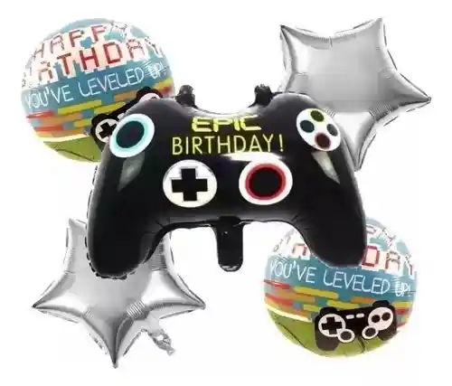Descripción: Celebra al máximo con este set de globos metalizados gamer inspirado en el mundo de los videojuegos. Incluye un globo central con forma de control y mensaje “Epic Birthday”, acompañado de 2 globos redondos con diseño “Happy Birthday Level Up” y 2 estrellas blancas. Características: Medidas: •1 Control: 69X48cm •2 Globos Redondos: 45x45cm •2 Globos Estrellas: 45x45cm •Diseño moderno ideal para fiestas gamer o temáticas juveniles. •Material: globo metalizado resistente y reutilizable. •Fácil de instalar y combinar con otros accesorios decorativos. Importante: •Los globos se entregan desinflados. •Solo se incluye lo que se indica en la descripción los demás elementos son decorativos para la foto.