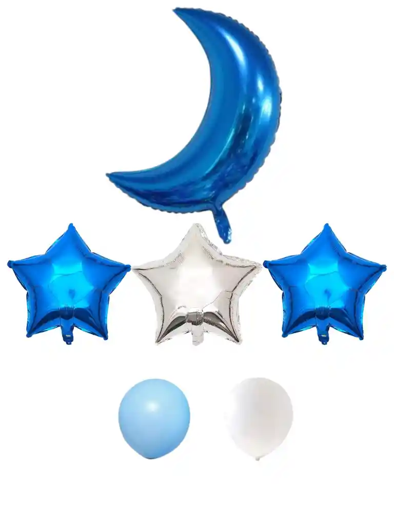 Decoracion fiesta de cumpleaños 1 Globos metalizado luna de 71 cm 3 globos metalizados estrellas de 45 cm 2 globos latex de color azul y blanco tamaño de 30 cm globos facil de inflar el globo se envia sin inflar si deseas algo adicional indicanos y con gusto te colaboramos