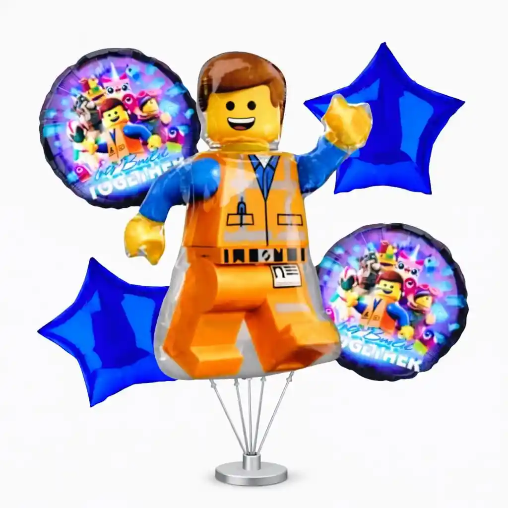 Bouquet X5 Globos Metálizados •1 Globo LEGO: 65x50cm •2 Globos Estrella 45x45cm •2 Globos Redondos 45x45cm Nota: •Los Globos vienen desinflados •Se pueden inflar con Helio