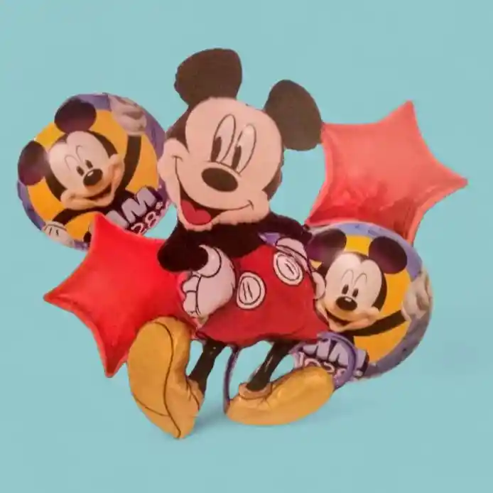 Set de 5 Globos Metalizados Mickey Mouse •1Globo Mickey Mouse 85cm x 50 cm •2 Globos Estrella de 45cm •2 Globos Redondos de 45cm Se pueden inflar con helio o con aire. Se venden desinflados