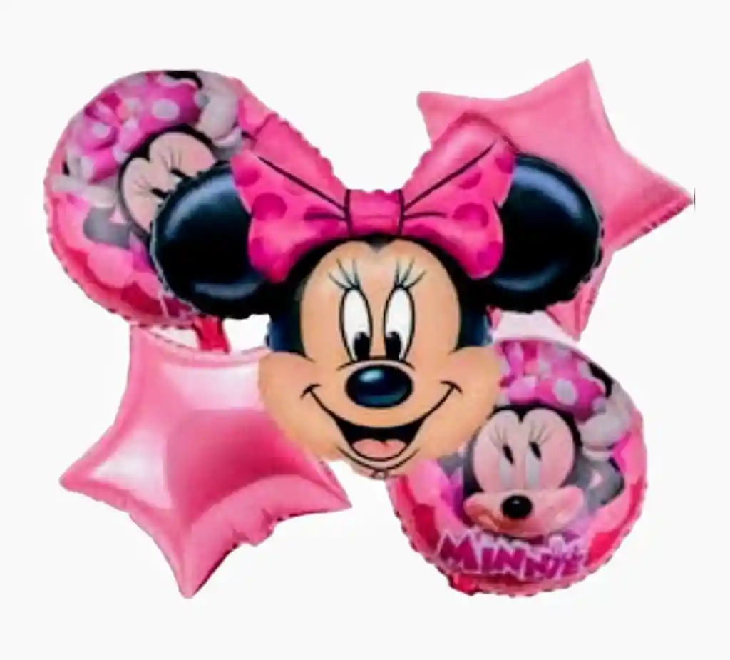 •1 Globo Figura Minnie: 65cm •2 Globos Estrella Rosado x 45 cm, c/u •2 Globos Circular 45 cm, c/u Tener en cuenta: * Los globos vienen Desinflados