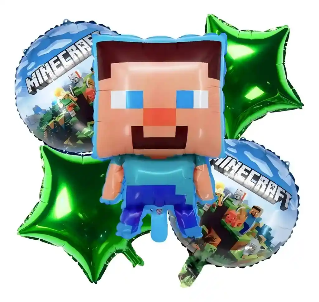 buquet de globos metalizados diseño de minecraft 1 globo grande de aproximadamente 65 cm 2 globos de estrellas metalizados de 45 cm 2 globos redondos de la tematica metalizados de 45 cm se envian sin inflar si deseas algo adicional indicanos y con gusto te colaboramos