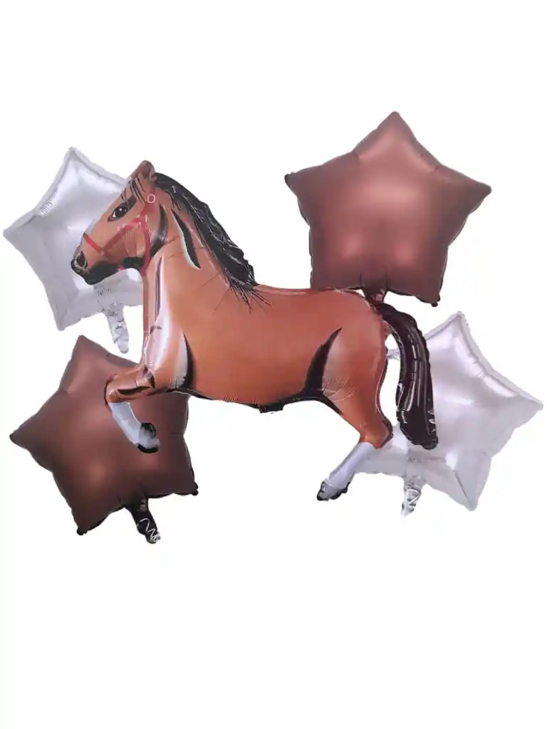 globos metalizados inclye 1 globo de caballo de aproximadamente 109 cm 2 globos de estrella de 45 cm en color plateado 2 globos de estrella de 45 cm en color cafe los globos se envian sin inflar si deseas adicionar algo mas indicanos y con gusto te colaboramos