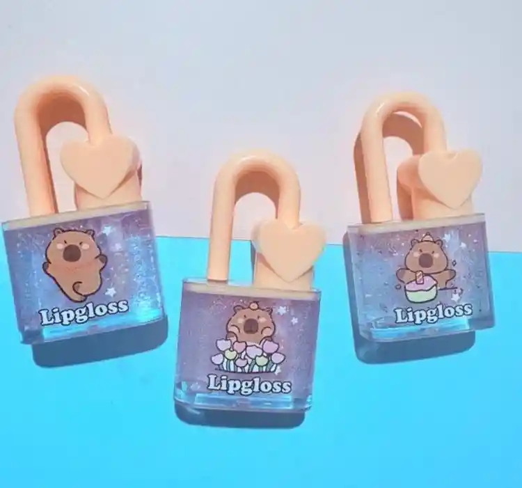 Este es un brillo labial (lip gloss) de capibara en envase de candado