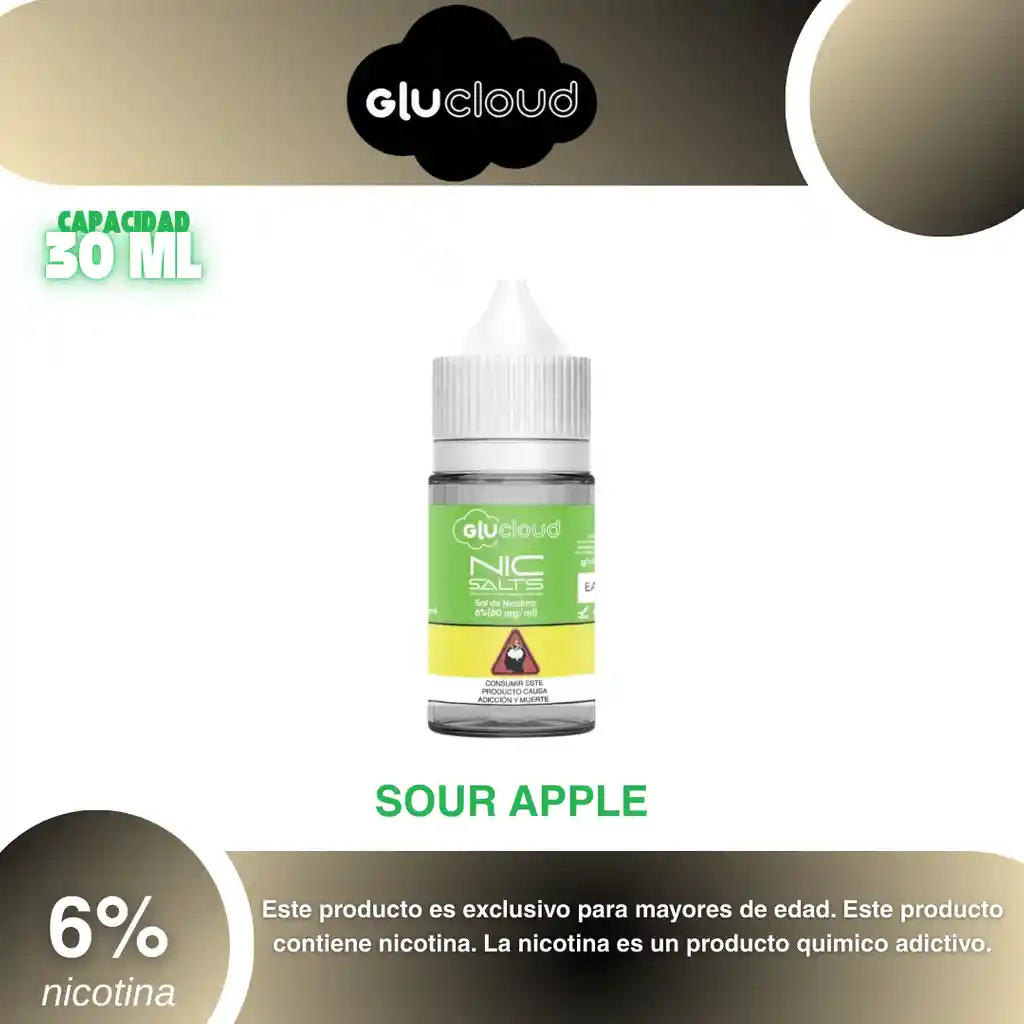 Glu Cloud Salt Sabor Manzana 60% PROHIBIDA LA VENTA A MENORES DE EDAD. ADVERTENCIA: ESTE PRODUCTO CONTIENE NICOTINA, LA NICOTINA ES UNA SUSTANCIA QUIMICA ADICTIVA Y NOCIVA PARA LA SALUD. Los líquidos para vapeo contienen: propilenglicol USP, glicerina USP, sabor artificial y nicotina. Este producto puede contener nicotina, una sustancia altamente adictiva que puede generar dependencia, posibles afectaciones arteriales, cardiacas, pulmonares y otras aun no identificadas. No se recomienda su uso a mujeres en embarazo, puede generar lesiones al feto. Mantener alejado de niños y mascotas. No ingerir, puede generar irritación y/o intoxicación. Por favor antes de consumir consulte a su médico posibles afectaciones o sensibilidad a alguno de sus componentes. Los componentes de este producto pueden aumentar la sensación de ansiedad En caso de notar alguna reacción adversa por favor suspenda su uso de manera inmediata. Siga las instrucciones en el envase. No alterar sus componentes. Adquiera sus productos en sitios de confianza No use productos piratas, alterados, o en los cuales no pueda comprobar su buena procedencia, Verifique la reputación del fabricante y distribuidor antes de adquirir cualquier producto Si no es usuario fumador o vapeador no se recomienda su uso bajo ninguna circunstancia Al usar este producto usted es consciente que este producto puede generar afectaciones a su salud, incluyendo aquellas que a la fecha de la compra no se han identificado y que pueden aparecer a largo plazo