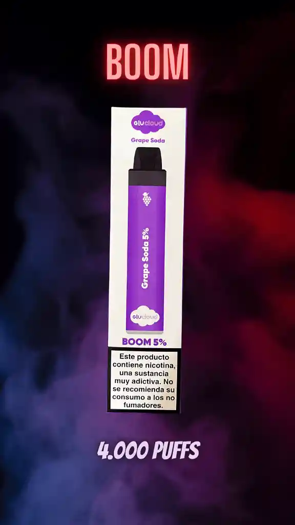 Glucloud Grape Soda 4000 Pffs BOOM Prohibida la venta a menores de edad. Producto nocivo para la salud que contiene nicotina, sustancia altamente adictiva. Antes de consumir consulte las indicaciones y contraindicaciones de uso