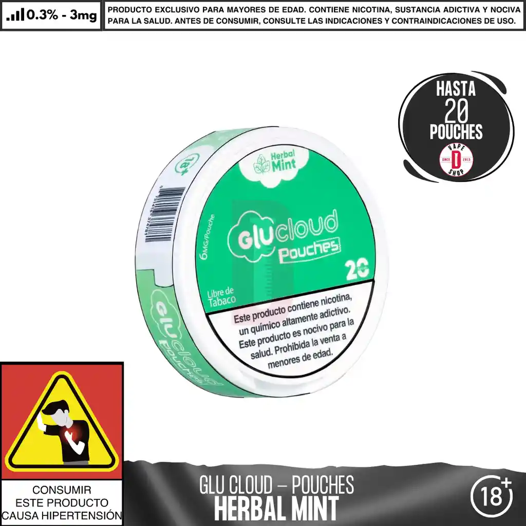 Descubre una nueva forma de consumir nicotina. Los Pouches/bolsas de nicotina de Glu Cloud te permiten consumir nicotina en cualquier momento y lugar. No te compliques, si quieres dejar de fumar o si solo no quieres incomodar, con nuestros pouches/bolsas sin tabaco puedes confiar en una satisfacción instantánea y duradera. *Los pouches/bolsas de nicotina NO SE MASTICAN NI SE INGIEREN*. Sabores: Ice mint (menta helada) Herbal mint (menta herbal) Sweet pink (sabor a chicle) Citrus ice (cítrico helado) Lush ice (sandía helada) Advertencia: Contiene nicotina, que puede ser venenoso. Evitar el contacto con la piel y los ojos. No ingerir. Mantener siempre en empaque original y en un ambiente fresco y seco. Mantener alejado de niños y mascotas. No debe utilizarse por Mujeres en estado de embarazo o personas con problemas de respiración como el asma. En caso de accidente contacte a la línea 123.
