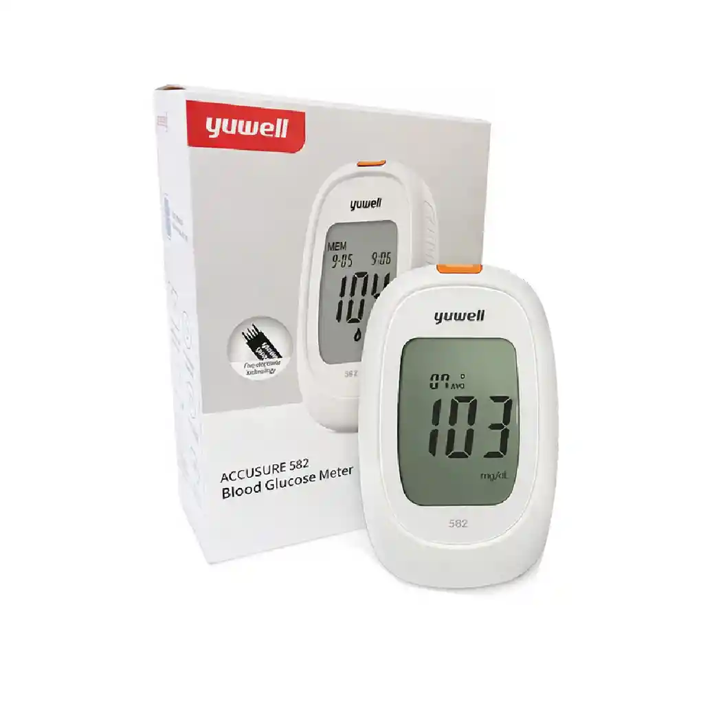 Glucómetro digital con memoria y bluetooth Yuwell 582 El Yuwell 582 es un glucómetro digital diseñado para personas que necesitan monitorear sus niveles de glucosa en sangre de forma regular, precisa y sencilla. Su tecnología de autocodificación elimina la necesidad de configuraciones manuales, reduciendo errores y facilitando su uso diario. Gracias a su diseño compacto, su pantalla LCD de fácil lectura y sus funciones inteligentes, este dispositivo es ideal tanto para uso en el hogar como para el seguimiento médico continuo. BENEFICIOS PRINCIPALES -Autocodificación: no requiere ingreso manual de códigos. -Medición rápida: resultados en solo 8 segundos. -Alta precisión: tecnología confiable para el control diario. -Bajo volumen de muestra: requiere solo 1 µL de sangre. -Memoria interna: almacena hasta 250 resultados. -Promedios automáticos: 7, 14, 30, 60 y 90 días. -Pantalla LCD clara: lectura fácil y cómoda. -Botón de expulsión de tiras: mayor higiene al retirar la tira. -Diseño portátil: ideal para llevarlo contigo. -Funciones avanzadas: opción de retroiluminación, voz y conectividad Bluetooth ESPECIFICACIONES TÉCNICAS -Modelo: Yuwell 582 -Tipo de dispositivo: Glucómetro digital -Enzima: Glucosa Oxidasa (GOD) -Unidades de medición: mg/dL o mmol/L -Volumen de sangre: 1 µL -Tiempo de medición: 8 segundos -Rango de medición: 20 – 600 mg/dL 1.1 – 33.3 mmol/L -Capacidad de memoria: 250 resultados -Promedios automáticos: 7, 14, 30, 60 y 90 días -Pantalla: LCD -Temperatura de operación: 10 °C – 40 °C -Rango de hematocrito: 30% – 60% -Alimentación: 2 baterías AAA ¿PARA QUIÉN ESTÁ INDICADO? -Personas con diabetes tipo 1 o tipo 2. -Usuarios que requieren monitoreo frecuente de glucosa. -Adultos mayores que buscan un dispositivo fácil de usar. -Personas que desean llevar registro y control de sus mediciones. -Uso personal o bajo indicación médica. ¿CÓMO SE USA? 1. Inserta una tira reactiva compatible en el glucómetro. 2. Aplica una gota de sangre en la tira. 3. Espera 8 segundos. 4. Lee el resultado en la pantalla. 5. Retira la tira usada utilizando el botón de expulsión. ¿QUÉ INCLUYE? -Glucómetro Yuwell 582 -Estuche protector -Manual de uso -No incluye tiras reactivas ni lancetas. REGISTRO INVIMA: INVIMA 2021DM-0024839 Garantía de fábrica: 1 año contra defectos de fabricación. PREGUNTAS FRECUENTES 1. ¿El monitor Yuwell 582 requiere codificación manual? No. El Yuwell 582 cuenta con autocodificación, por lo que no es necesario ingresar códigos al cambiar las tiras reactivas, reduciendo errores y facilitando su uso. 2. ¿Puedo guardar y revisar mis resultados anteriores? Sí. El dispositivo tiene una memoria interna para hasta 250 mediciones y calcula automáticamente promedios de 7, 14, 30, 60 y 90 días, lo que permite un mejor seguimiento de la glucosa. 3. ¿Cómo funciona la conectividad Bluetooth? El Yuwell 582 permite transferir los resultados vía Bluetooth a dispositivos compatibles, facilitando el registro digital de las mediciones y el seguimiento con tu médico o cuidador.