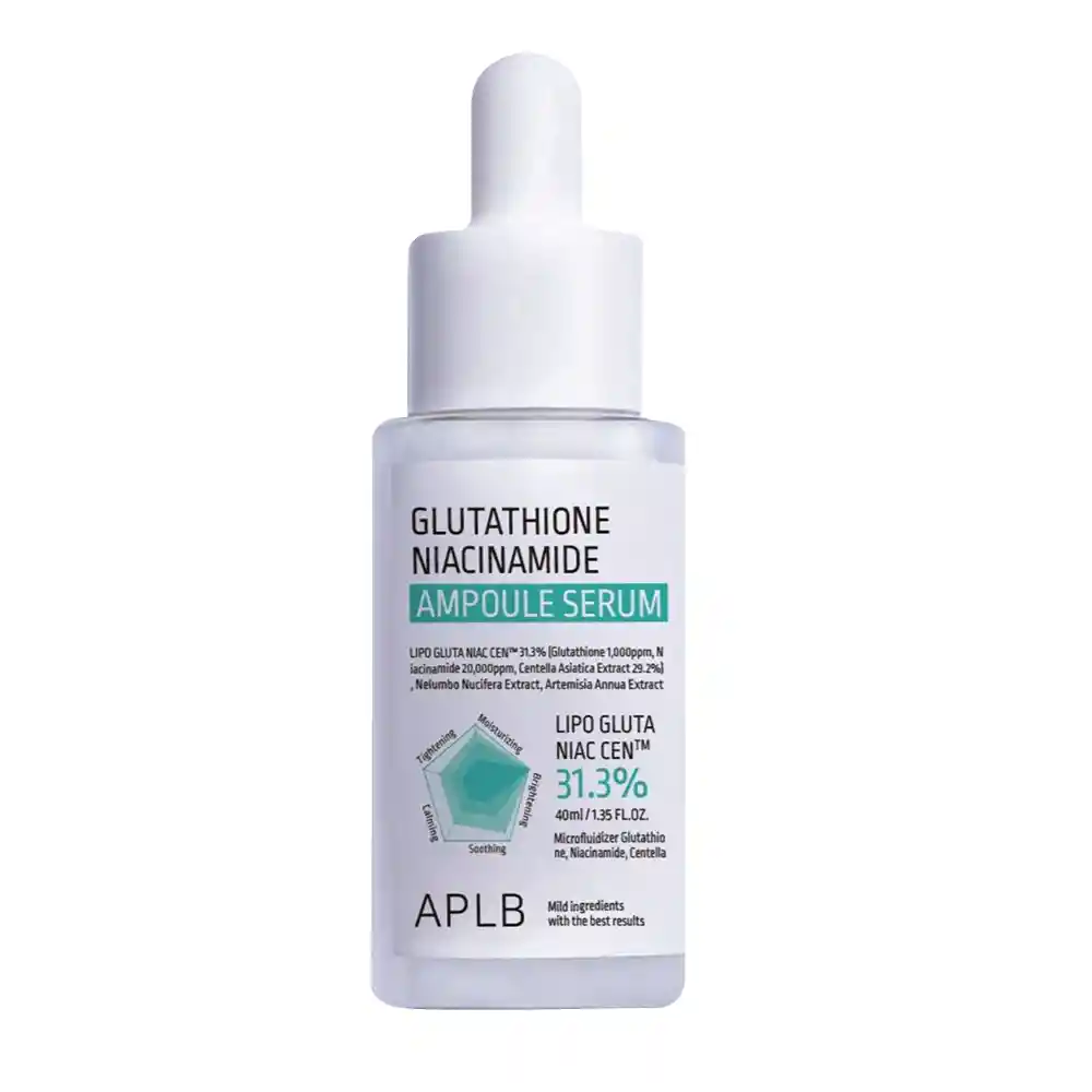 Glutathione Niacinamide Ampoule Serum x 30ml | APLB es un suero facial concentrado de textura ligera y rápida absorción, formulado para iluminar, unificar el tono y mejorar la apariencia general de la piel. Su combinación de Glutatión y Niacinamida ayuda a reducir la apariencia de manchas, controlar el exceso de grasa y fortalecer la barrera cutánea, dejando la piel visiblemente más luminosa, equilibrada y saludable. Ideal para pieles opacas, con tono irregular o signos de estrés cutáneo.