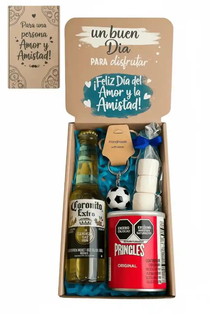 Incluye: 1 botella de cerveza coronita 210 ml, 1 papas pringles 37 g, 1 pack de malvaviscos, 1 llavero de pelota de fútbol. Caja especial, papel picado, moño, globo y tarjeta. Presentación: lista para regalar. Escribe tu dedicatoria en “Comentario al Shopper”.