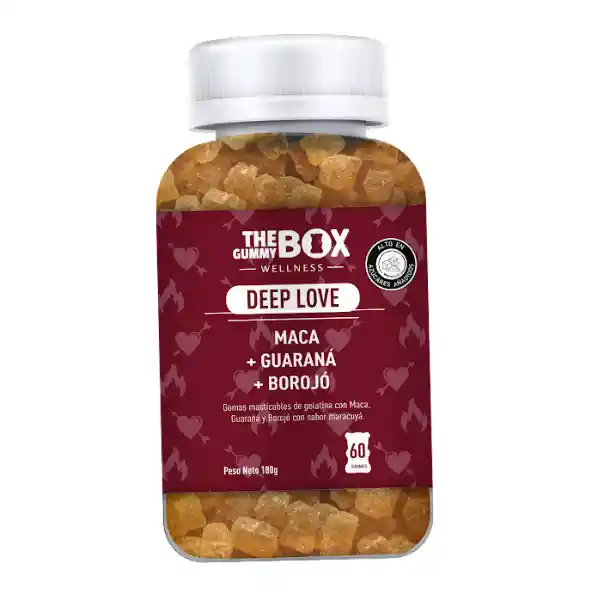 Maca Guaraná y Borojó en gomitas! Deep Love: Las Gomitas del Amor de Esperanza Gomez. Las gomitas Deep love de The Gummy Box Wellness tienen componentes naturales como Maca, Guaraná y Borojó que te ayudarán a mantener el ánimo arriba, a tener mayor estimulación, a tener vitalidad física, a incrementar el interés por tu pareja y a tener un sueño reparador. • Maca: Aumento del deseo sexual o libido y virilidad. • Guaraná: Aporta energía al cuerpo. • Borojó: Mejora el funcionamiento del corazón, sistema nervioso y digestivo. Potenciador Sexual en gomas Deep Love The Gummy Box de uso diario. Gomas de Gelatina, Suplemento Multivitamínico X 60 Gomitas. • Genero: Unisex. Recuerda NO es viagra. Son aumentadoras de apetito sexual, puedes usarla todos los días para mejorar tu salud sexual. Beneficios: • Corazón feliz. • Ánimo Arriba. • Vitalidad Física. • Sueño Reparador. • Fluidez Verbal. • Mayor Estimulación. Porción diaria recomendada: Minimo 2 Gomas - Máximo 4. Lo recomendable es consumir en pareja de forma diaria para aumentar el libido de ambos. Condiciones de Almacenamiento: Cierre bien el envase después de cada uso. Conserve en un lugar fresco y seco a una temperatura inferior a 25°C, protegido de la luz sola directa. No requiere refrigeración. Producto listo para consumir. Advertencia: Si se encuentra en estado de embarazo, lactancia o presenta alguna condición médica, consulte a su profesional en salud. Este producto no sirve para diagnóstico, tratamiento, cura o prevención de alguna enfermedad y no suple una alimentación equilibrada. Prohibida la venta a menores de edad. Confidencialidad: Tus pedidos se envían en una caja o sobre totalmente sellado opaco sin ningún tipo de marcas externas. Para nosotros es muy importante tu privacidad.