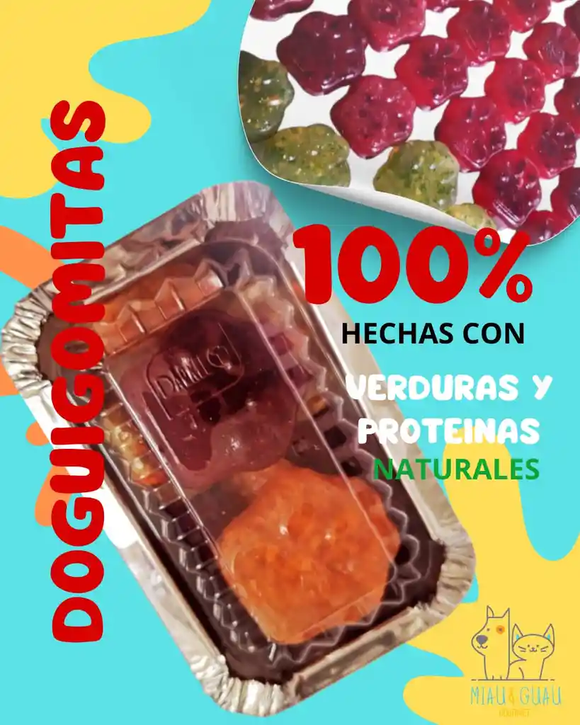 🍬 Doguigomitas Miau & Guau Gourmet 🐶💚 Deliciosas y saludables gomitas naturales para perritos, elaboradas con proteínas de pollo, carne e hígado y verduras frescas como espinaca, remolacha y zanahoria 🥩🥕🌿. Suaves, nutritivas y sin conservantes, son el snack ideal para premiar, entrenar o simplemente consentir a tu peludo con algo delicioso y 100% natural. ✅ Aportan energía y proteínas ✅ Mejoran la digestión ✅ Refuerzan el sistema inmunológico ✅ Libres de colorantes y saborizantes artificiales 💚 Miau & Guau Gourmet – Amor hecho snack natural.