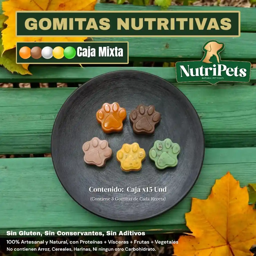 Caja Mixta Contiene: 3 Gomitas de Cada Receta Disponible (son 5 recetas) Total= 15 Gomitas para Perros ⚪️3 Gomas de COLAGENO PURO 🟢3 Gomas de MAL ALIENTO Y DIGESTION 🟠3 Gomas de SISTEMA INMUNE 🟤3 Gomas de PIEL Y PELAJE 🟡3 Gomas de CALCIO Y ARTICULACIONES GOMITAS NUTRITIVAS, Tipo Gelatina. (Producto Refrigerado) Para todas las Razas y Edades (Perros) 🥣 Con Proteínas + Frutas + Vegetales ❌️ Sin Aditivos, Sin Conservantes 💯 100% Artesanal y Natural✅️