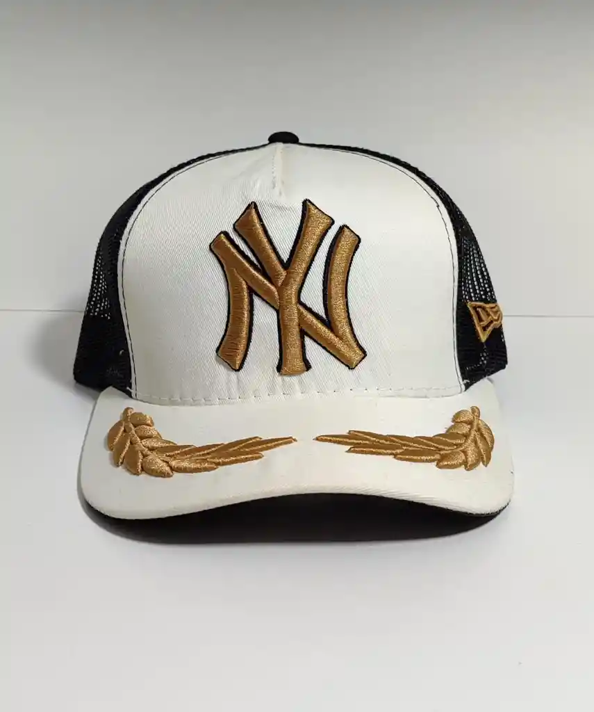 Destaca con esta gorra exclusiva estilo Yankees. Diseño en blanco con panel trasero en malla negra y detalles dorados en el logo y visera. Ideal para un estilo urbano premium.