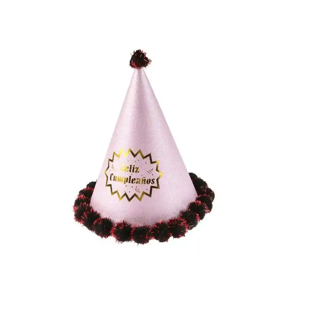 Hermoso gorro en forma de cono de color rosado escarchado, con bordes de pompones y con frase feliz cumpleaños.