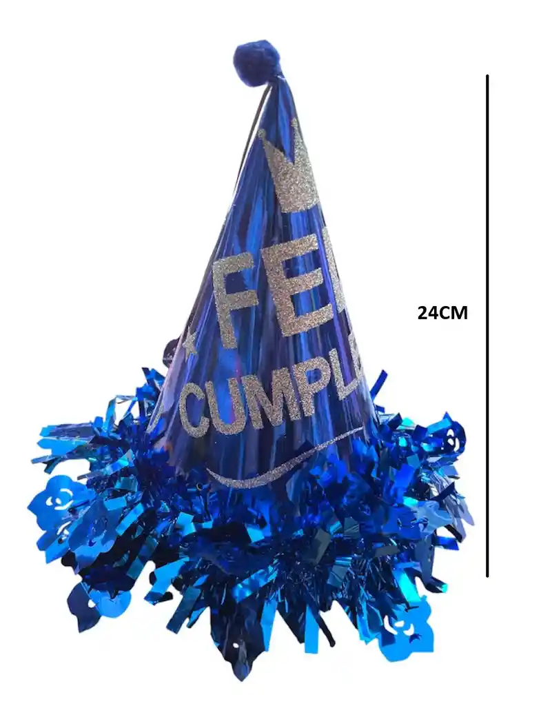 Gorro con letras escarchadas plateadas feliz cumpleaños fondo azul metálico