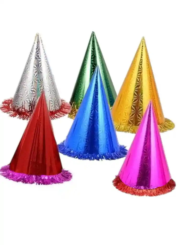 6 gorros para celebraciones cumpleaños colores metalizados medidas 28 cm alto gorro en papel talla aultos y niños disponible para entega inmediata