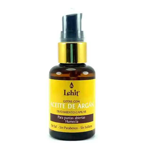 Gotas Con Aceite De Argan Lehit Contiene: Frasco 50G Especial para cabellos que hayan sido sometidos a procesos de alisado o presenten maltrato extremo. Gotas de tacto ligero y rapida absorcion que restauran e hidratan el cabello dando fuerza y flexibilidad a la fibra capilar. Del mismo modo alivian las puntas que están abiertas, frágiles y/o quebradizas, recuperan el brillo y la elasticidad perdida. Dejan el cabello libre de frizz, protegen el color, desenredan, mejora la manejabilidad y facilita el peinado. Modo De Uso Aplicar una pequeña cantidad sobre el cabello, peine o moldee a través de una distribución uniforme