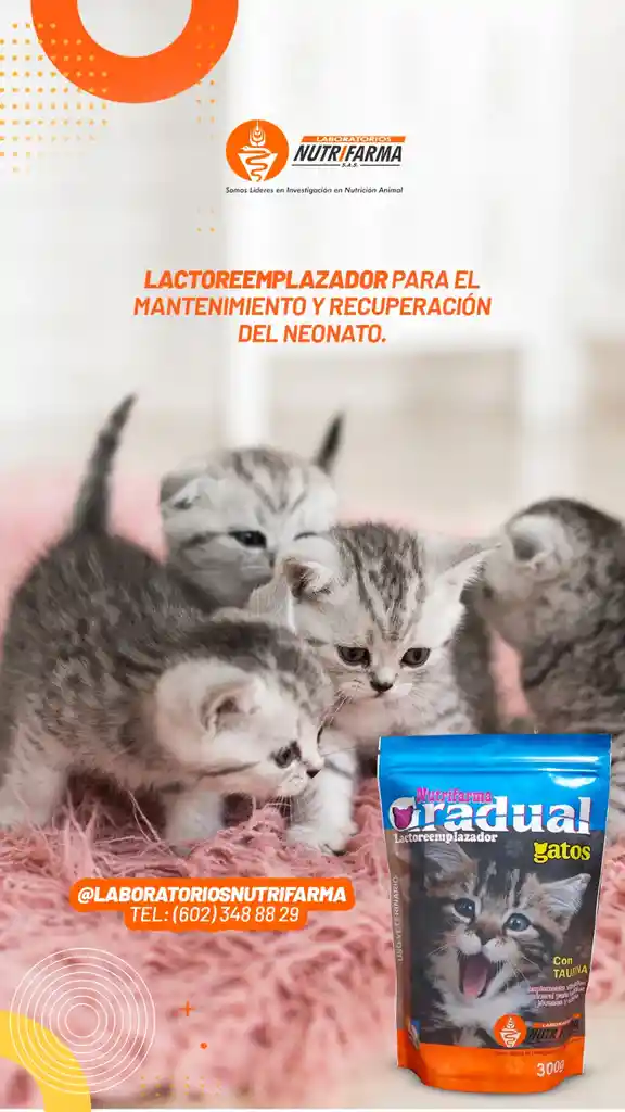Gradual Gatos de 300 gramos con TAURINA al 0.50% lo cual es una concentración adecuada para lograr varias cosas dentro de la fisiología del gato a su vez ser coadyuvante en procesos de recuperación de problemas oculares, cardíacos, digestivos, desarrollo neurológico y sistema inmunológico; fabricado por Laboratorios Nutrifarma SAS es un suplemento vitamínico mineral para Gatos cachorros específicamente, jóvenes y Adultos diseñado para el cuidado y bienestar de tus felinos. Su fórmula única proporciona una nutrición equilibrada como proteína al 32%, Grasas al 24%, Cenizas al 10%, Fibra al 1%, Humedad al 8% y vitaminas tales como la A, B1, B2, y otras que apoyan la salud general de los gatos, ayudando a mantener su energía y vitalidad. Este producto es ideal para aquellos dueños que buscan lo mejor para sus mascotas, asegurando que reciban los nutrientes necesarios para una vida activa y saludable. La presentación de 300g es perfecta para un uso diario, facilitando la administración y asegurando que tu gato disfrute de cada porción. Gradual Gatos se elabora con ingredientes de alta calidad, seleccionados para satisfacer las necesidades específicas de los gatos en diferentes etapas de su vida. Su textura y sabor son irresistibles, lo que lo convierte en una opción atractiva para los felinos más exigentes. Además, este producto es fácil de incorporar en la dieta de tu gato, ya sea como complemento o como parte de su alimentación regular. Con Gradual Gatos, puedes estar seguro de que estás brindando a tu mascota un producto que respeta su salud y bienestar. Dale a tu gato el cuidado que merece con esta opción de nutrición de confianza.