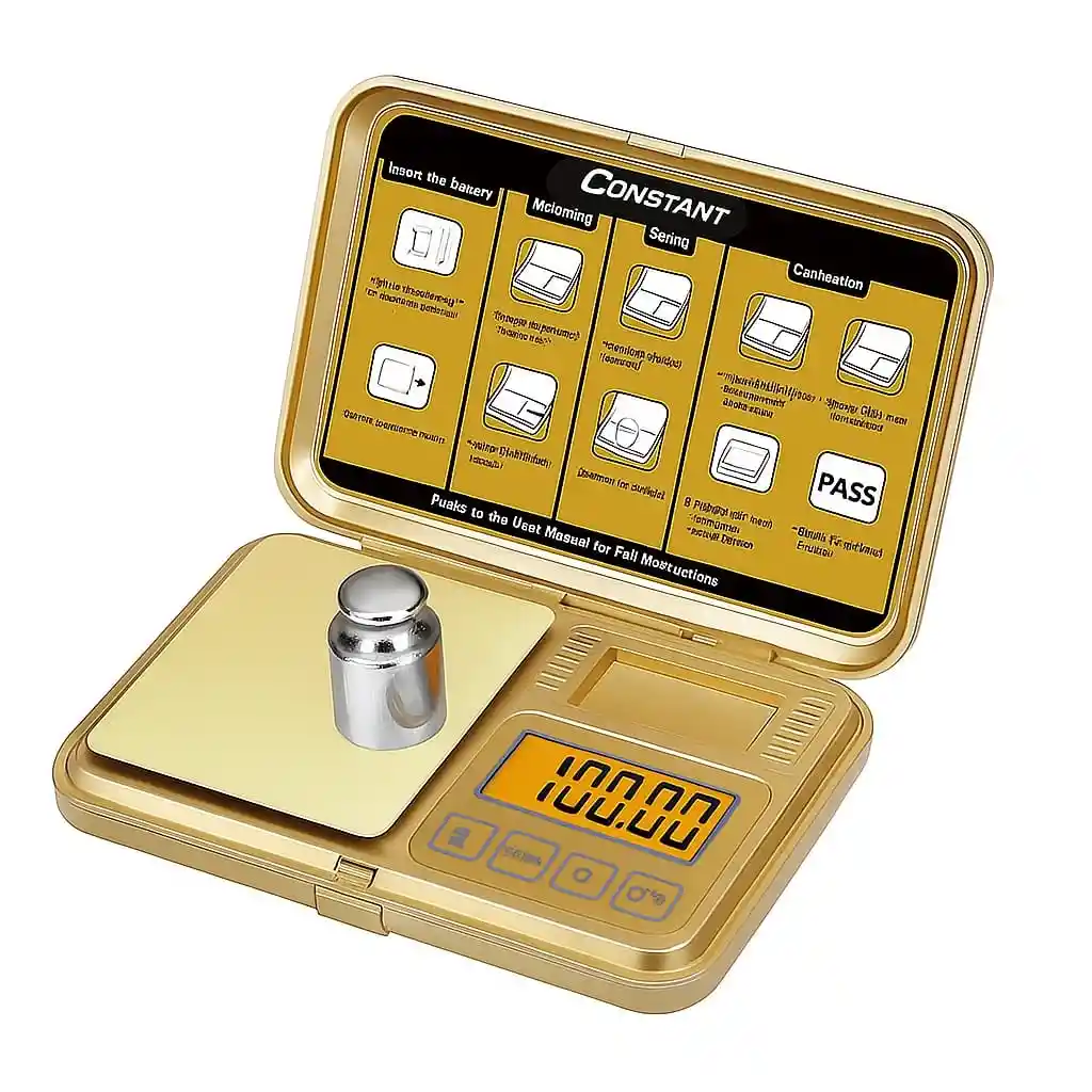 Gramera Digital Dorada Constant Modelo 14192-678C Descripción: Elegante gramera digital Constant modelo 14192-678C, diseñada con acabado dorado de alta calidad y precisión profesional. Ideal para joyería, laboratorio o uso doméstico gracias a su tamaño compacto y pantalla LCD retroiluminada. •Color: Dorado con detalles metálicos •Pantalla: Digital con iluminación ámbar •Función: Pesaje de alta precisión (gramos, onzas, quilates, etc.) •Material: Plástico resistente y plataforma metálica •Incluye: Pesa de calibración plateada •Modo de uso: Inserta las baterías, calibra y pesa con exactitud •Aplicaciones: Ideal para pesar joyas, oro, plata, piedras, cosméticos, especias y más •Condición del producto: Nuevo Producto práctico, elegante y preciso, perfecto para entornos donde la presentación y exactitud son esenciales.