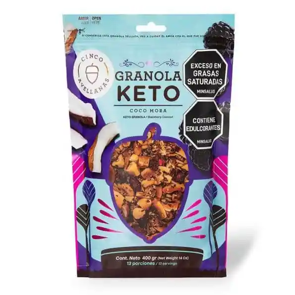 La granola keto coco mora de Cinco Avellanas es un producto artesanal apto para la dieta keto. Es rica en proteína y fibra, baja en carbohidratos, no contiene azúcar añadida ni grasas trans. La dieta keto es un plan alimenticio que busca disminuir el consumo de carbohidratos, y le da prioridad a las proteínas y grasas. Al eliminar los carbohidratos por completo, el organismo produce un estado metabólico llamado cetosis. Esto quiere decir que tu cuerpo se ve forzado a producir unas sustancias químicas (conocidas como cuerpos cetónicos), que son formadas a partir de la grasa corporal. En pocas palabras: tu cuerpo no tiene más opción que utilizar la grasa extra como principal fuente de energía para poder seguir funcionando.