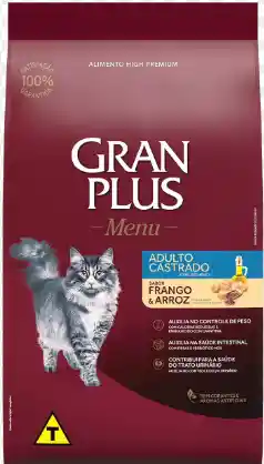 Castrados Granplus - Pollo y Arroz Granplus presenta su Alimento para Gatos Adultos Castrados con sabor a Pollo y Arroz, una fórmula única diseñada para satisfacer los gustos más exigentes y mantener la salud de tu felino. Elaborado con ingredientes nobles y cocido al vapor, este alimento no contiene colorantes ni sabores artificiales, garantizando una alimentación natural y segura. Con calorías reducidas y enriquecido con carnitina, ayuda en el control de peso de tu gato castrado. Además, con fibra y prebióticos, promueve la salud intestinal, y ayuda a controlar el pH urinario, contribuyendo así a la salud de las vías urinarias. Confía en Granplus para proporcionar a tu gato castrado una nutrición equilibrada que promueva su bienestar general. Ofrezca el alimento siguiendo la cantidad diaria recomendada, dividida en dos o más porciones. Las cantidades indicadas son solo una orientación y pueden variar dependiendo del perro y del nivel de actividad física. Conoce más Fórmula del Alimento para Gatos Adultos 🐱🌿 Vitamina A 14000UI, Vitamina D3 406UI, Vitamina E 55UI, Vitamina K3 0,1mg, Vitamina B1 8mg, Vitamina B2 4,6mg, Vitamina B6 3,6mg, Vitamina B12 26μg, Pantotenato de Calcio 8,4mg, Ácido Fólico 1,1mg, Ácido Nicotínico 46,4mg, Biotina 0,1mg, Colina 1300mg, Zinc 75mg, Hierro 80mg, Manganeso 10mg, Yodo 1,8mg, Selenio 0,3mg, Cobre 10mg. Proteína (mín.) 36%; Grasas (mín.) 9%; Humedad (máx.) 10%; Fibra Cruda (máx.) 4%; Ceniza (máx.) 8,20%; Calcio (máx.) 1,65%; Calcio (mín.) 0,80%; Fósforo (mín.) 0,70%; Energía Metabolizable (mín.) 3600kcal/kg.