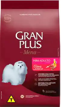 Gran Plus Adulto Mini con Carne y Arroz x 3Kg Gran Plus Adulto Mini con Carne y Arroz es un alimento premium para perros de razas pequeñas, diseñado para favorecer su salud intestinal y optimizar el funcionamiento del organismo. Enriquecido con omega 3 (EPA y DHA), apoya la salud general, mientras que el extracto de Yuca ayuda a reducir el olor de las heces. Sus proteínas seleccionadas aseguran una alta absorción y su mini partícula facilita la masticación. Ideal para mantener a tu perro sano y lleno de energía. BENEFICIOS: AYUDA EN LA SALUD INTESTINAL, con fibras y prebiótico MOS. CONTRIBUYE AL ÓPTIMO FUNCIONAMIENTO DEL ORGANISMO, con rica fuente de omega 3 (EPA y DHA). CONTRIBUYE A LA REDUCCIÓN DEL OLOR DE LAS HECES, con extracto de Yuca. FAVORECE LA ABSORCIÓN DE PROTEÍNAS, con ingredientes proteicos seleccionados que brindan un buen aprovechamiento para el organismo. MINI PARTÍCULA IDEAL, tamaño de partícula ideal que facilita la correcta masticación y agarre de los alimentos. COMPOSICIÓN BÁSICA Harina de carne y huesos de ovino, harina de tripa de ave, cangrejo de arroz, grano de maíz1, harina de gluten de maíz-601, grano de sorgo, frijoles Bandinha2, aceite de ave, aceite de pescado refinado, aceite de linaza, pulpa de remolacha deshidratada, salvado de trigo, levadura seca de cervecería, cloruro de sodio (sal común), cloruro de potasio, hidrolizado de hígado de aves y cerdo, aditivo prebiótico (pared celular de levadura fuente de manano-oligosacáridos), extracto de Yuca (min. 0,025%), antioxidantes (BHA, BHT), propionato de calcio, sorbato de potasio, aditivo adsorbente (pared celular de levadura y bentonita), vitaminas (A, D3, E, K3, B1, B2, B6, B12, pantotenato de calcio, ácido fólico, ácido nicotínico, biotina, cloruro de colina), minerales (sulfato de zinc, sulfato de hierro, sulfato de manganeso, yodato de calcio, selenita de sodio), minerales quelados (proteínato de manganeso, levadura enriquecida con selenio, proteinato de zinc, proteinato de cobre). ENRIQUECIMIENTO MÍNIMO POR KILOGRAMO DE PRODUCTO Vitamina A 14.000UI, vitamina D3 800UI, vitamina E 73UI, vitamina K3 0,1mg, vitamina B1 3,1mg, vitamina B2 8,7mg, vitamina B6 2,2mg, vitamina B12 48,6μg, pantotenato de calcio 20,6mg, ácido fólico 0,37mg, ácido nicotínico 23,8mg, biotina 0,02mg, colina 815mg, zinc 100mg, hierro 88mg, manganeso 5,8mg, yodo 1,5mg, selenio 0,4mg, cobre 11mg.