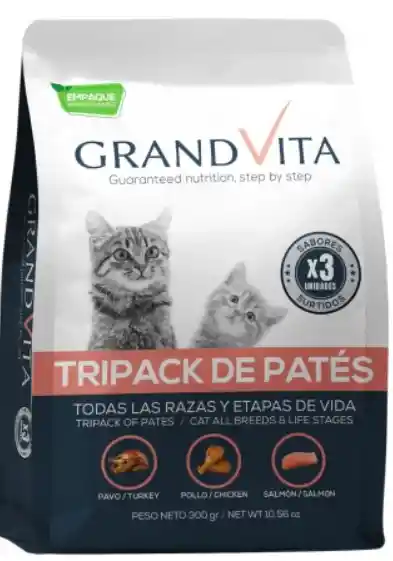 Alimento Húmedo Para Gato Grand Vita Tripack Surtido - Pavo, Pollo, Cordero 300 Gr brinda vitalidad para tu mascota en un solo bocado; Grand Vita paté, un alimento húmedo indicado para gatos de todos los tamaños y etapas de vida, una excelente opcion para complementar la alimentación diaria de las mascotas. Encuentra 3 sabores surtidos que le van a encantar a tu gato.