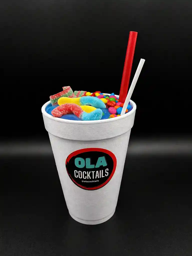 Granizado sabor Mora Azul con Vodka, 14° de alcohol, refrescante y dulce, acompañado de dulces. ¡Perfecto para disfrutar!