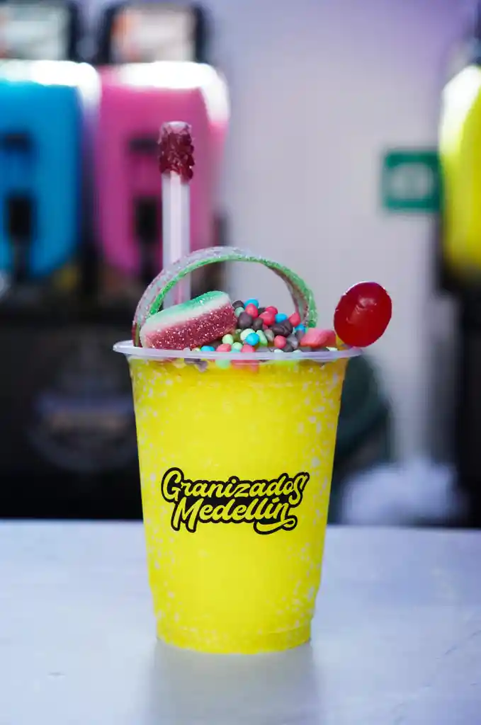 Granizado Mediano Sin Licor 14on, Dulces: 1 Okaloka, 2 Gusanos, 1 Sandia, 1 Chupeta