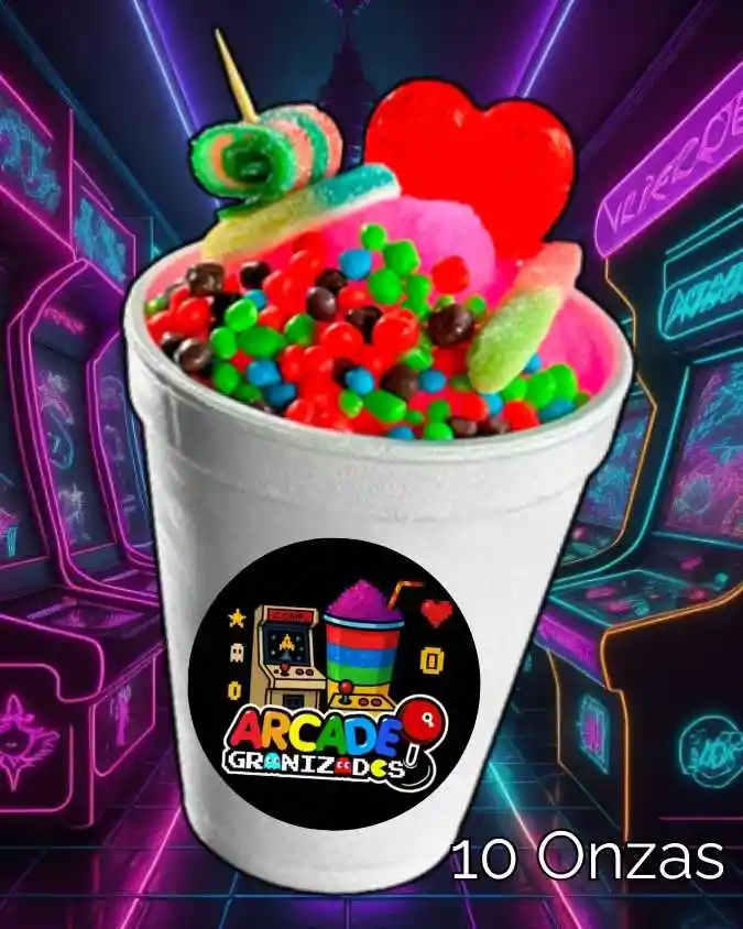 GRANIZADO PEQUEÑO DE 10 ONZAS CON LICOR AL 10% DECORADO CON SALES, DULCES Y PERLAS EXPLOSIVAS.